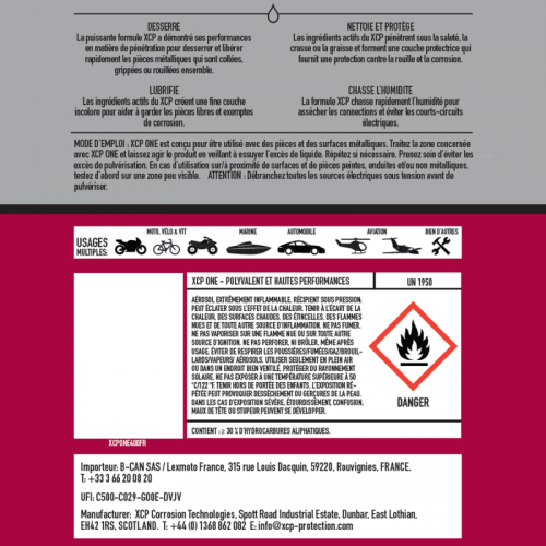 XCP® Professional ONE est un dégrippant / lubrifiant haute performance pour pénétrer, lubrifier, chasser l’humidité, nettoyer et protéger contre la corrosion. Il libère ce qui coince et fait taire ce qui grince…